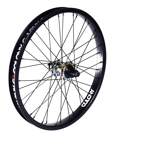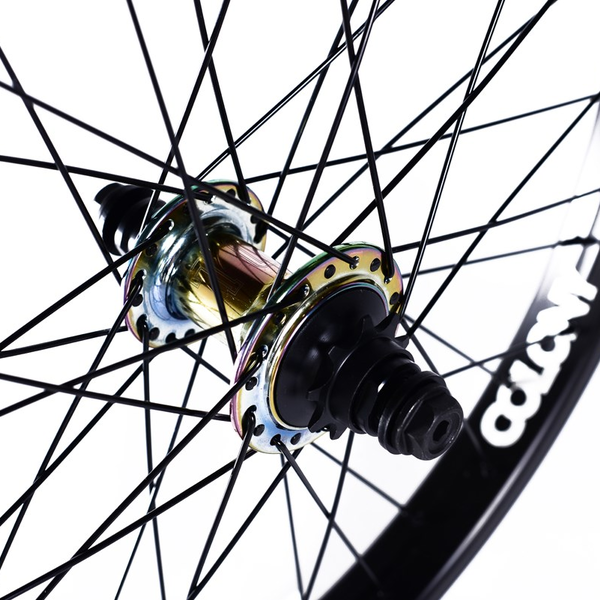 Pintour Cassette wheel set - Female 3/8 axle & 14mm inner axle to fit 14mm frames. Pinned Contour Rim, Wasp Hub laced with Black stainless steel spokes. Standard with 9T driver Available with Black rim and Black or Rainbow Hubs 36 hole only. Comes with Colony Rim strap.