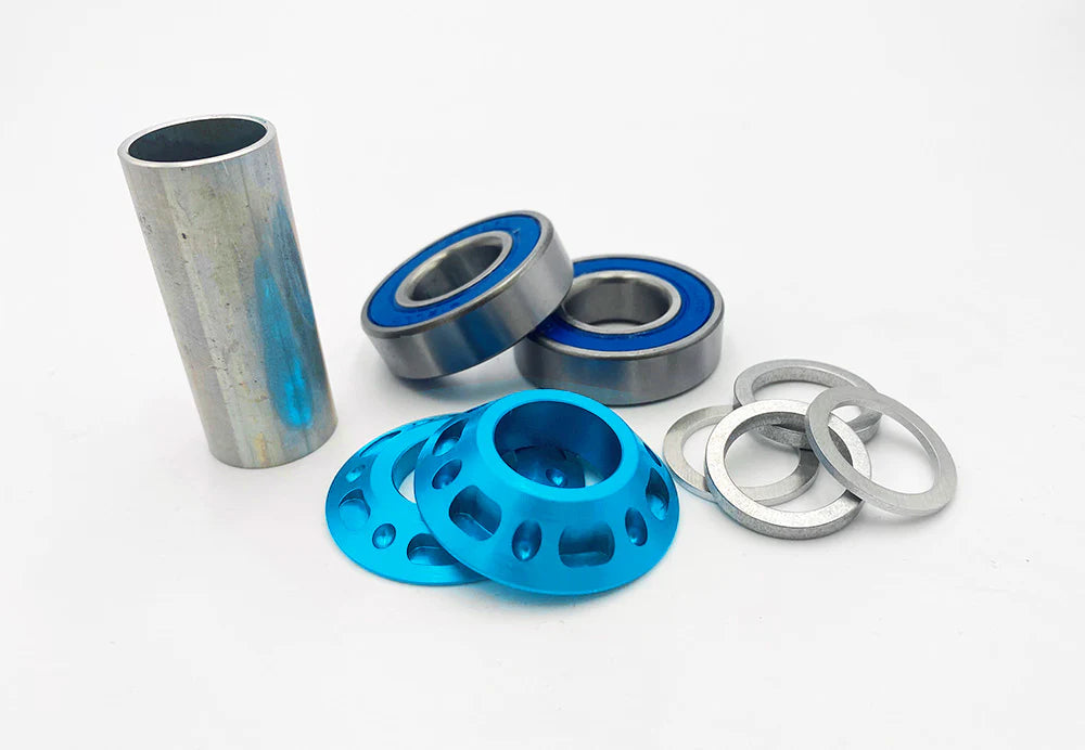 Stacked Official Word: Are you looking for that perfect bottom bracket to make your bike stand out along with outperform all the rest, The Knight UFO Mid Bottom Bracket Kit includes 2 precision Enduro sealed bearings, 2 CNC machined 6061 aluminum cone spacers for a clean look, an aluminum internal spacer, 4 steel crank arm spacers for dialing in your chain alignment. Fits 19mm and 22mm Crank Spindles. Available in multiple colors to customize your bike to then finest detail. Stop on by or order online.